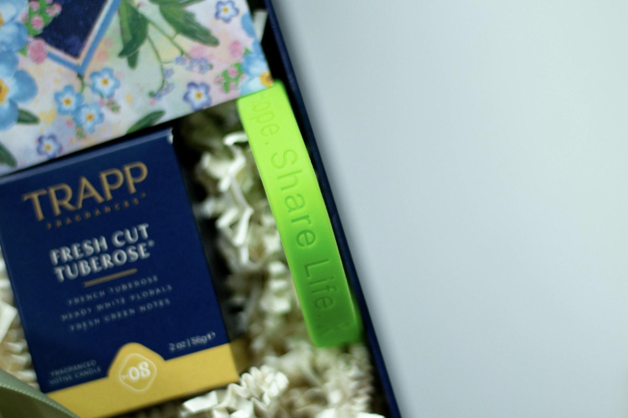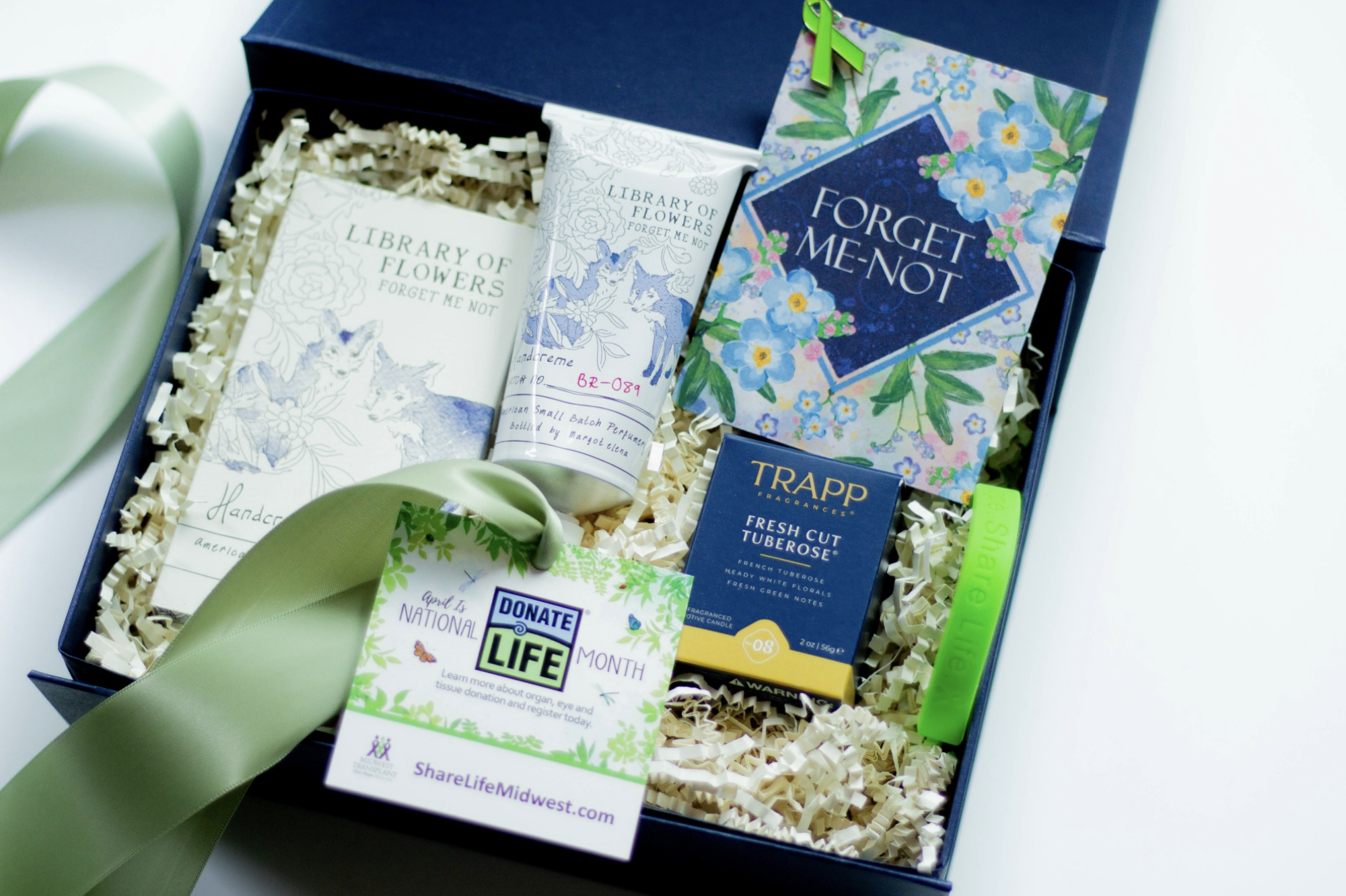 The following year, in 2022, we leaned into the theme of “Forget Me Not” with a floral-forward custom gift design. Each gift included a candle from Trapp Candle Co. in Fresh Tuberose scent, a packet of Blue Forget-Me-Not seeds ready for planting in the garden, Forget-Me-Not scented Hand Cream from Library of Flowers, and a Midwest Transplant Network-branded bracelet and green ribbon pin. The navy blue tones pair so well with the brand-specific greens. Plus, we love how a theme comes together so well, as forget-me-not flowers remind us of the lasting legacy and memories donors leave behind.